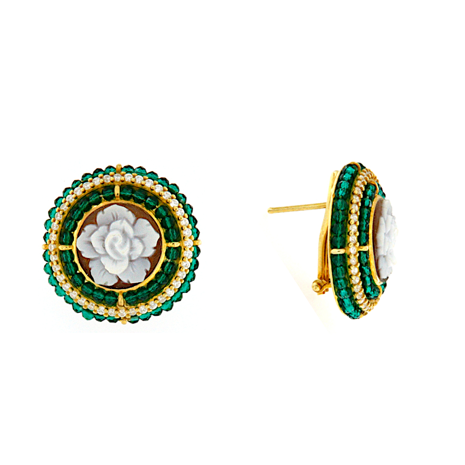 Orecchini rotondi in argento dorato con cammeo inciso, spinelli verdi idrotermali e zirconi. Chiusura ponte retto e clips