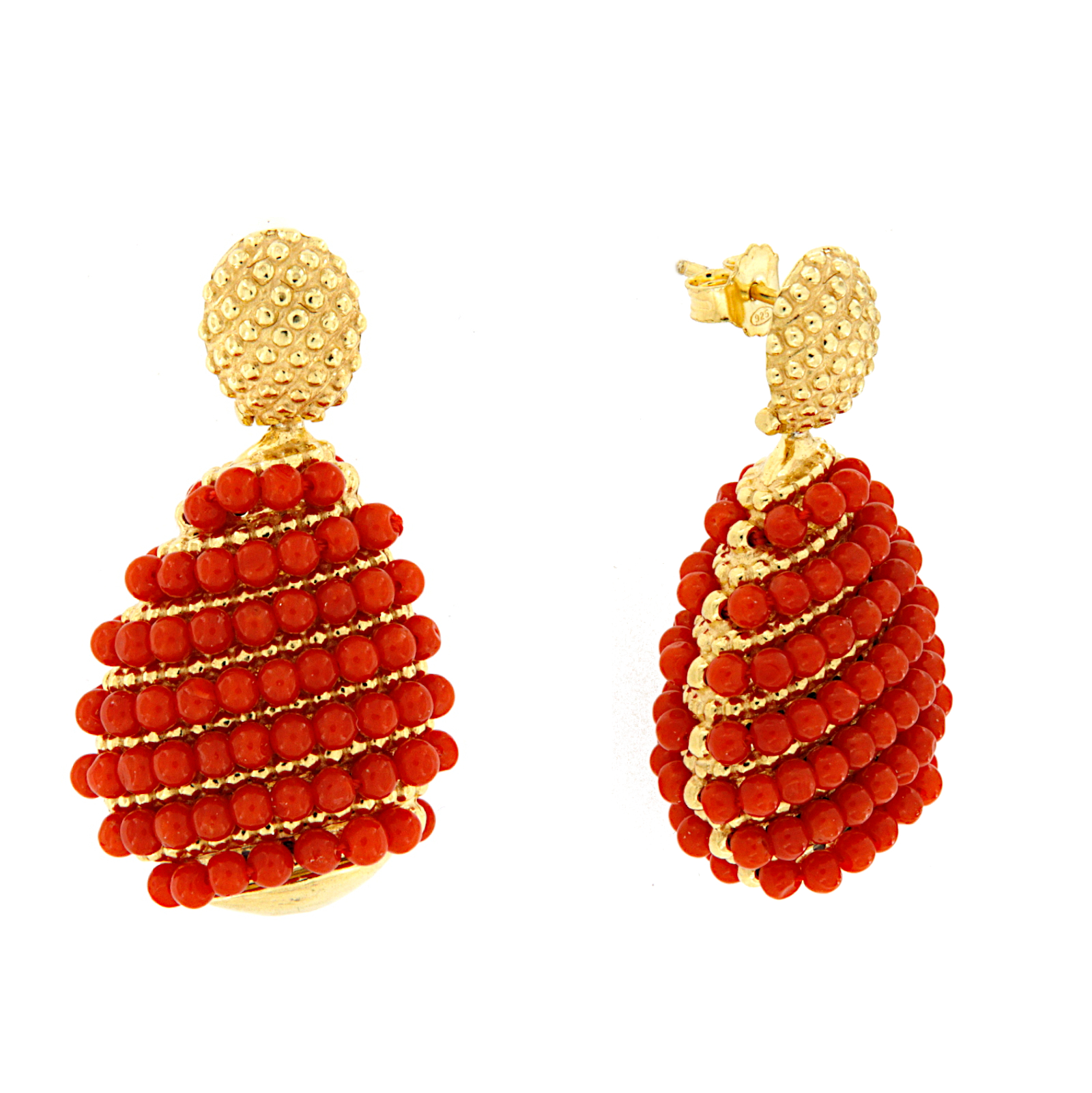 Orecchini in argento dorato con pendente a goccia con sferine di corallo.