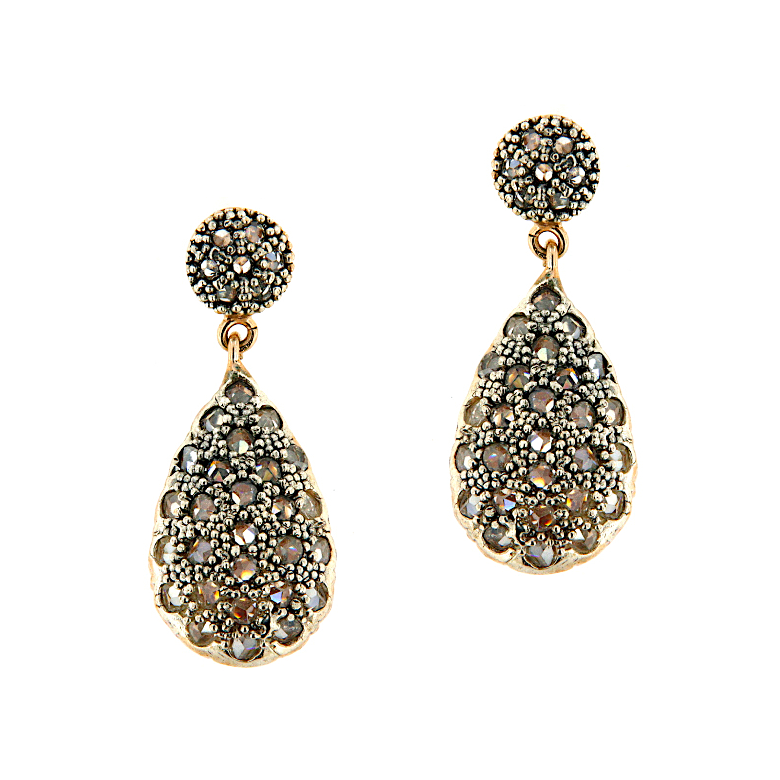 Orecchini pendenti in argento riproduzione della gioielleria in stile antico a forma di goccia con incassati zirconi.