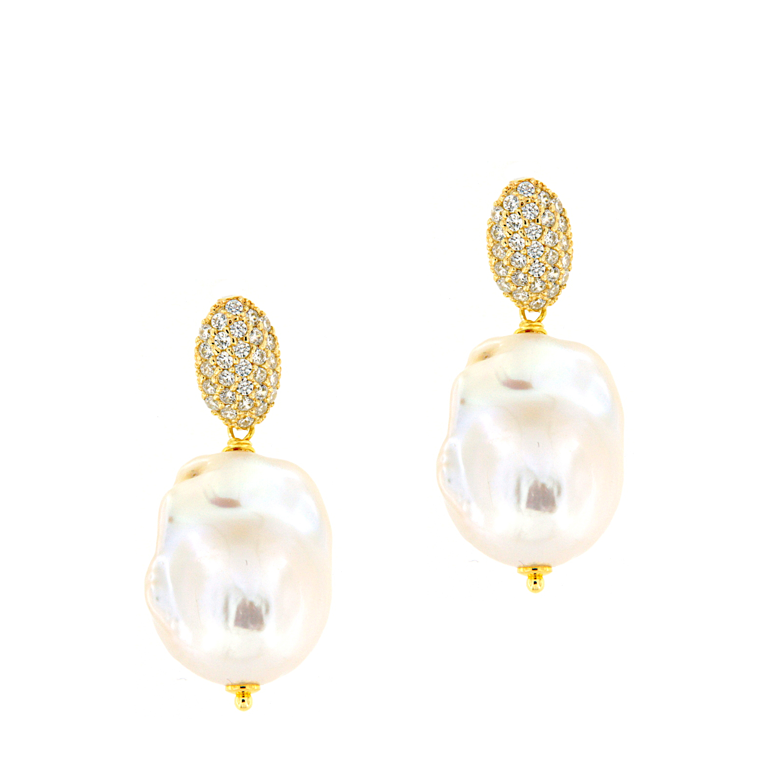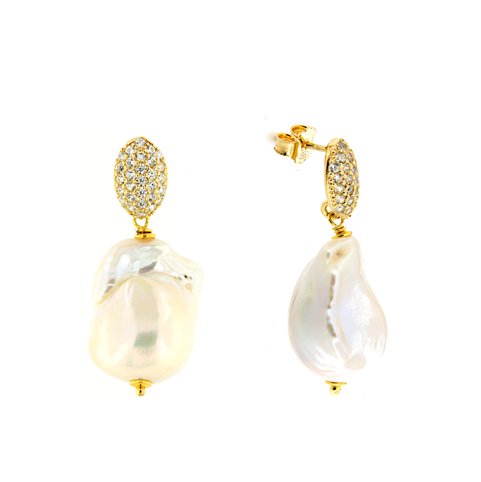 Orecchini pendenti in argento dorato con incassati zirconi e perle coltivate d'acqua dolce barocche.