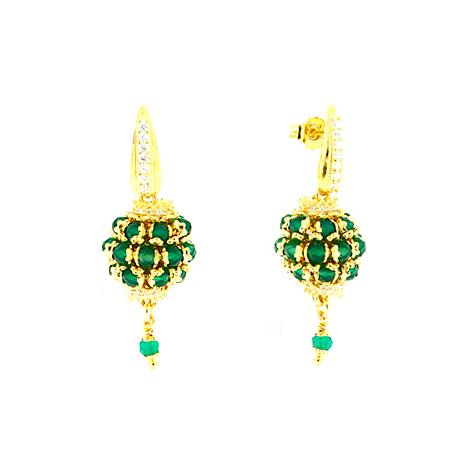 Orecchini pendenti in argento dorato con zirconi e more di spinelli idrotermali verdi. Chiusura perno e vite a pressione.