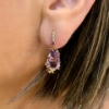 Orecchini in oro rosa con gocce di ametista pendenti con incassati intorno diamanti taglio brillante e zaffiri colorati. Chiusura perno e vite a pressione.