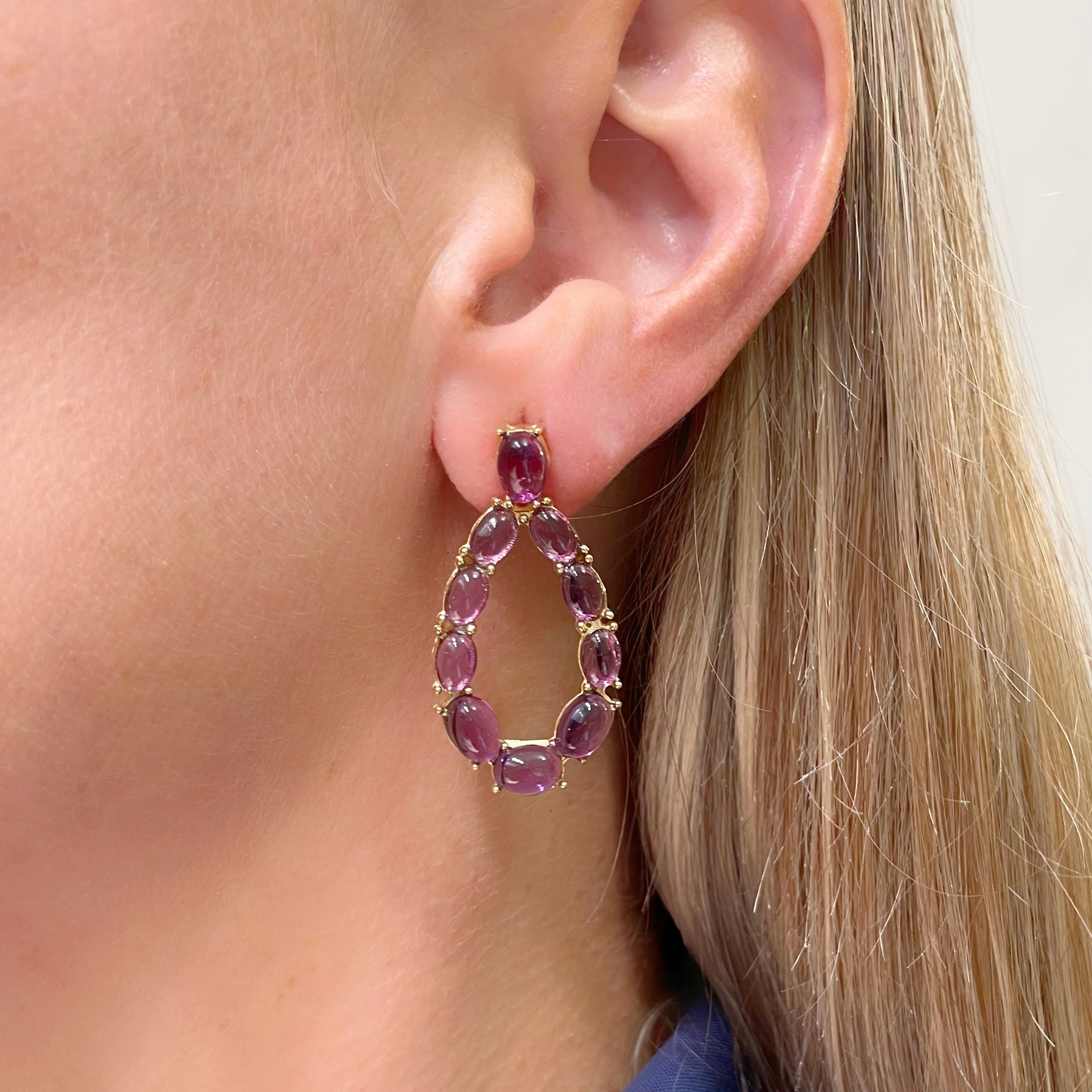 Orecchini pendenti in argento a goccia con cabochon ovali di ametista idrotermale.