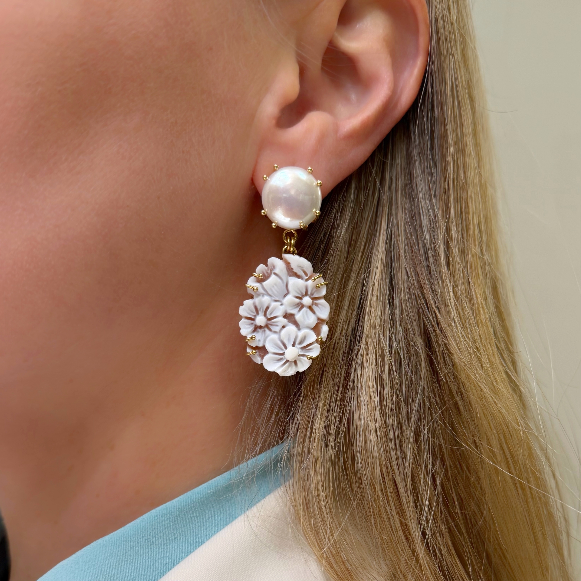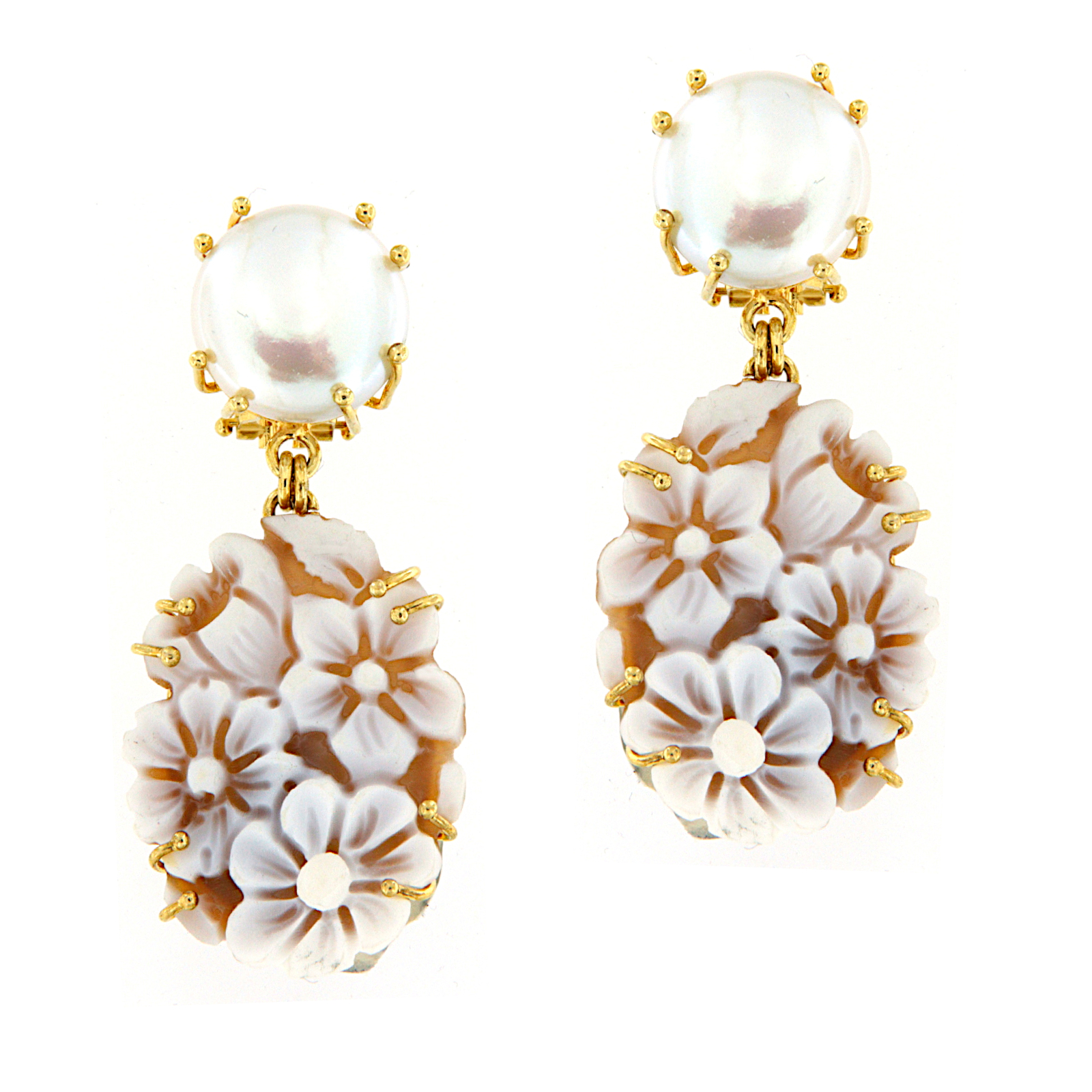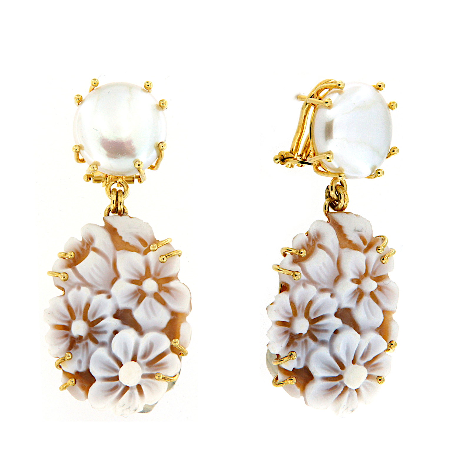 Orecchini in argento dorato con perla coltivata di acqua dolce a bottone e cammeo pendente. Chiusura ponte retto e clips