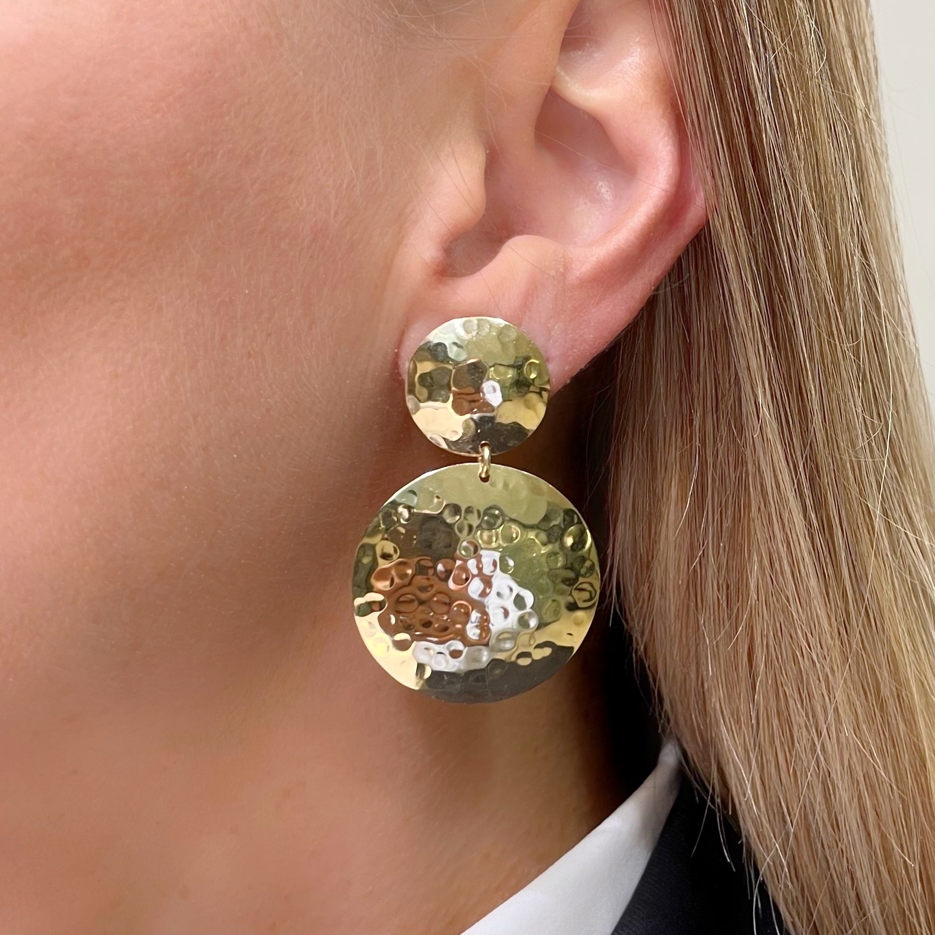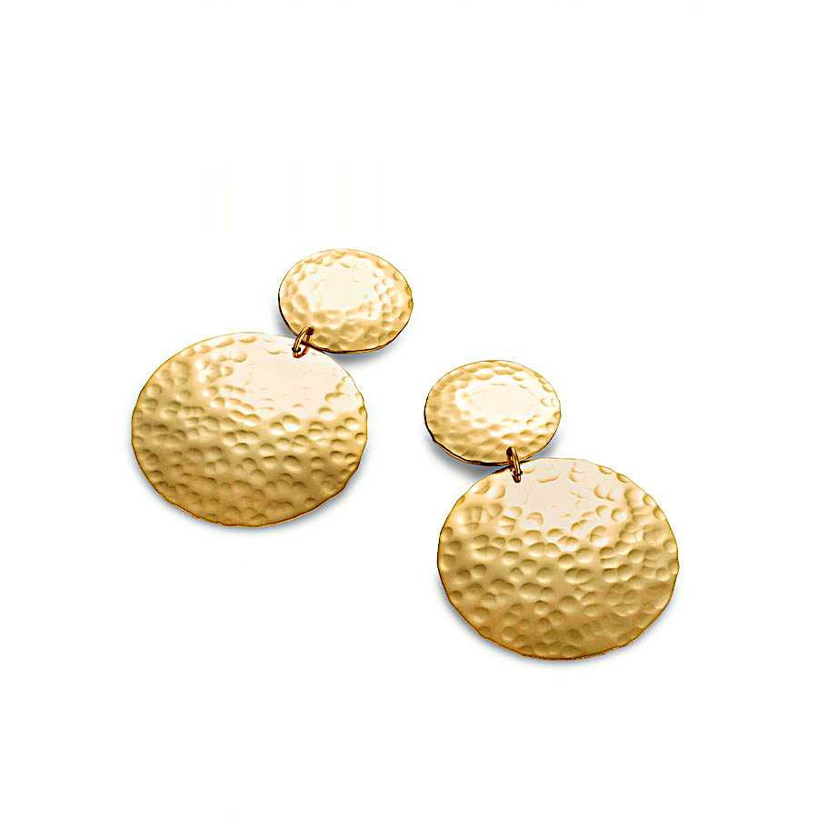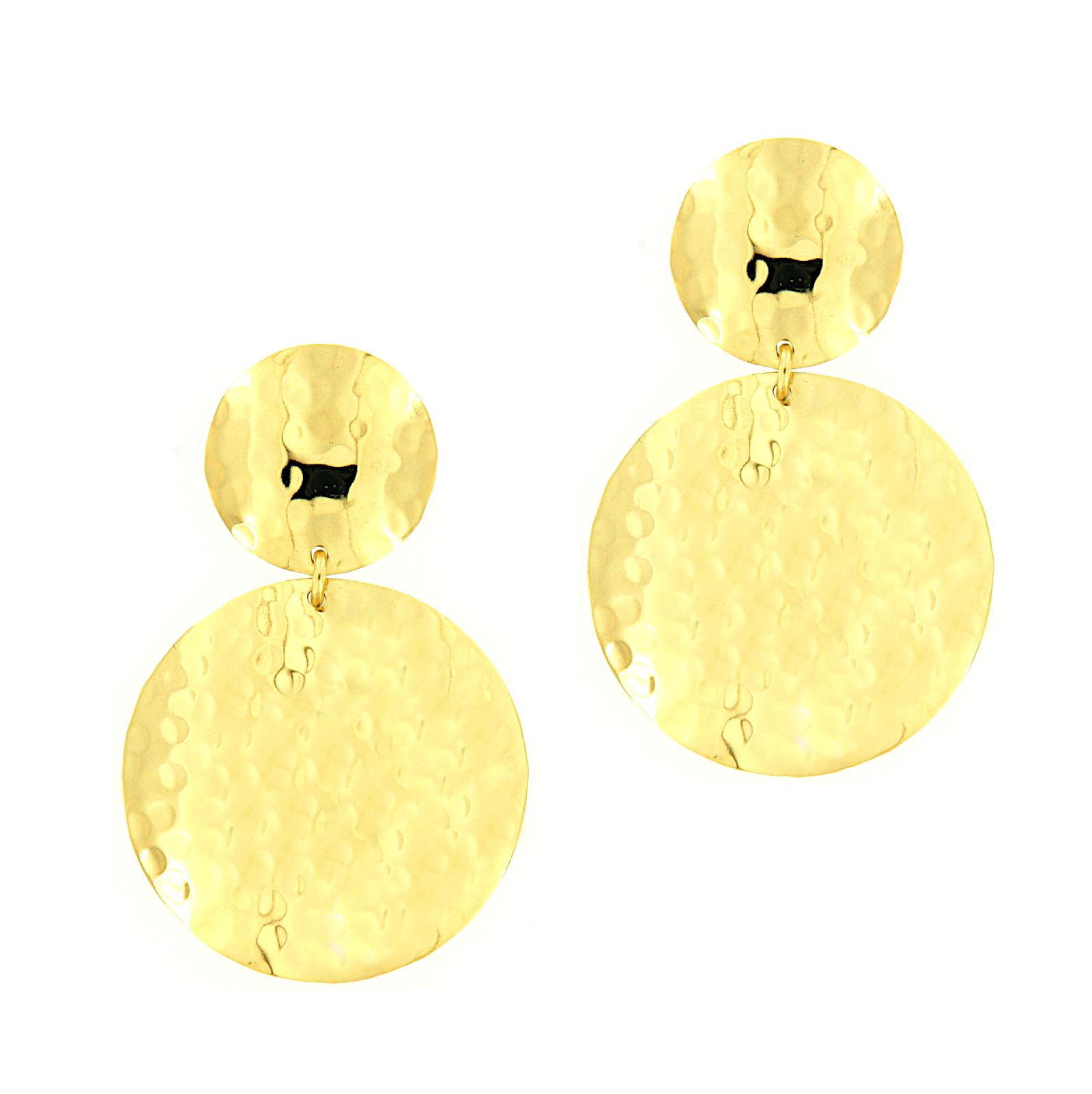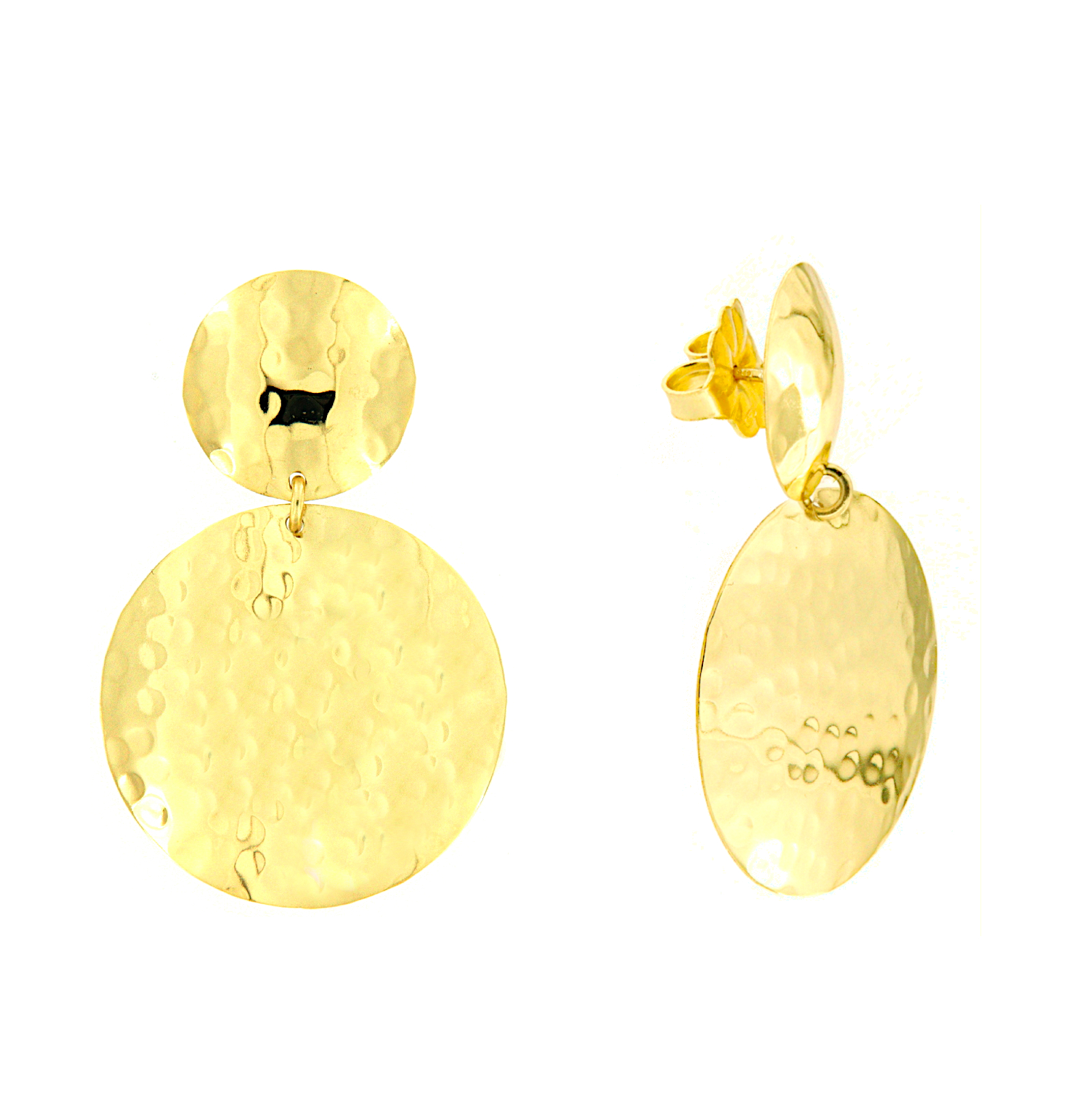 Collezione Nuova Retrò. Orecchini pendenti in argento dorato a doppio disco con avorazione martellata e lucida