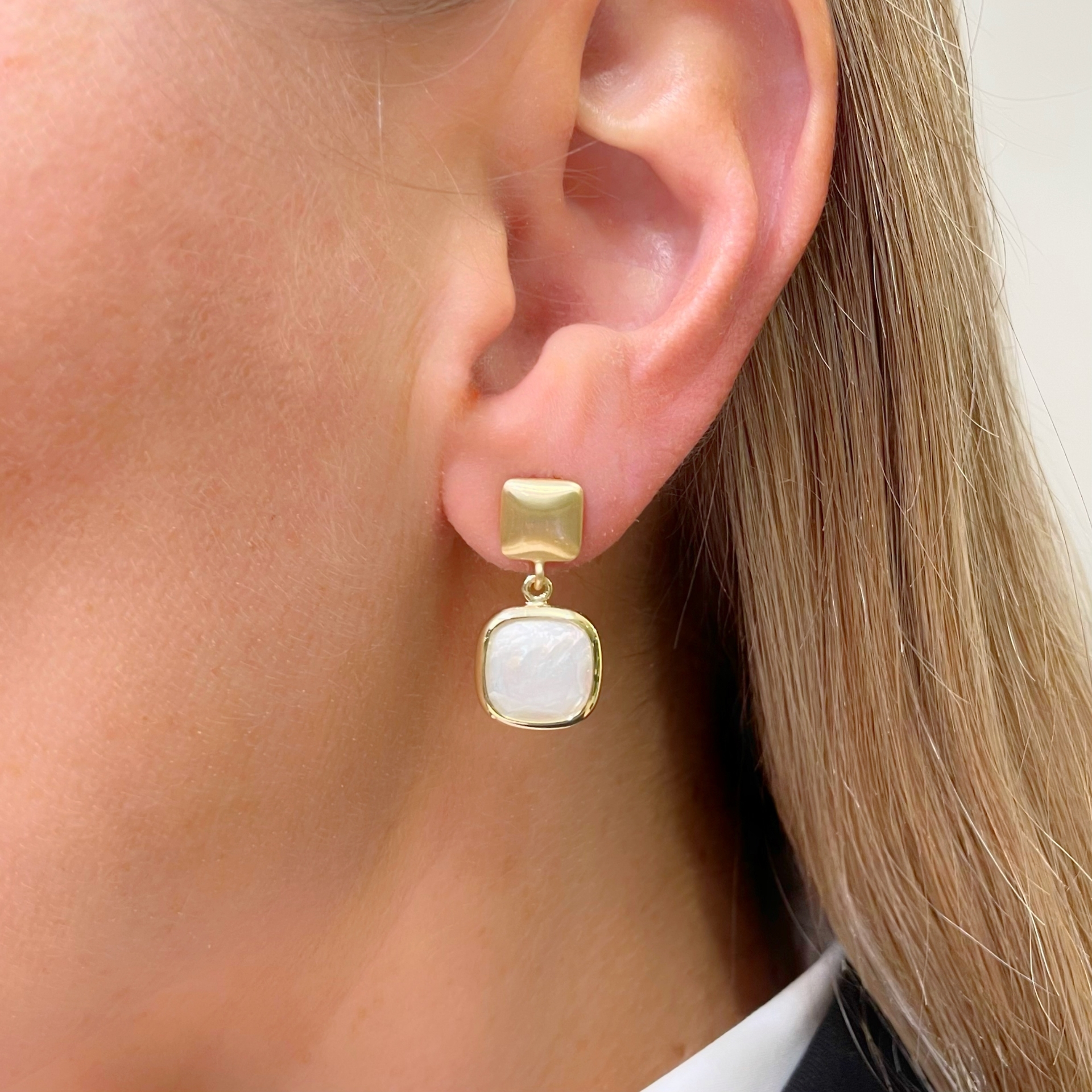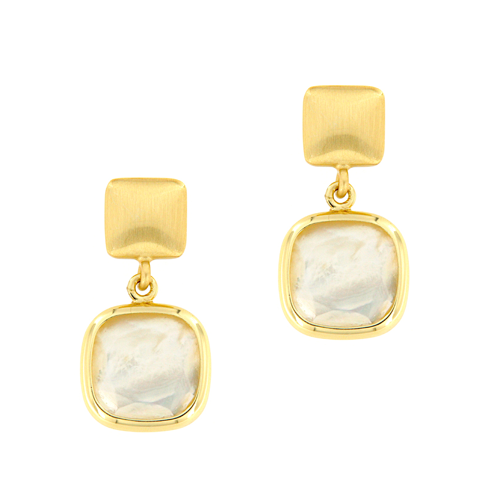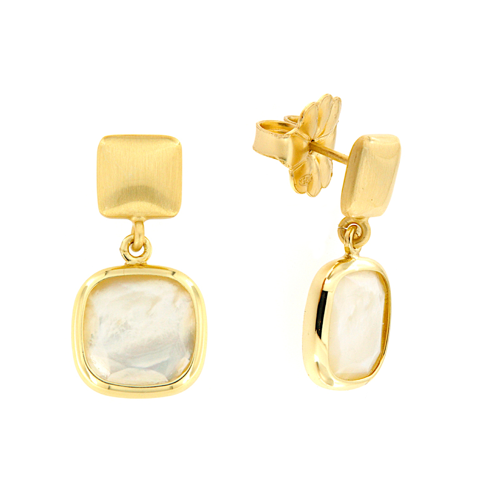 Collezione Mignon. Orecchini in argento dorato con saponetta satinata e pendente squadrato in madreperla