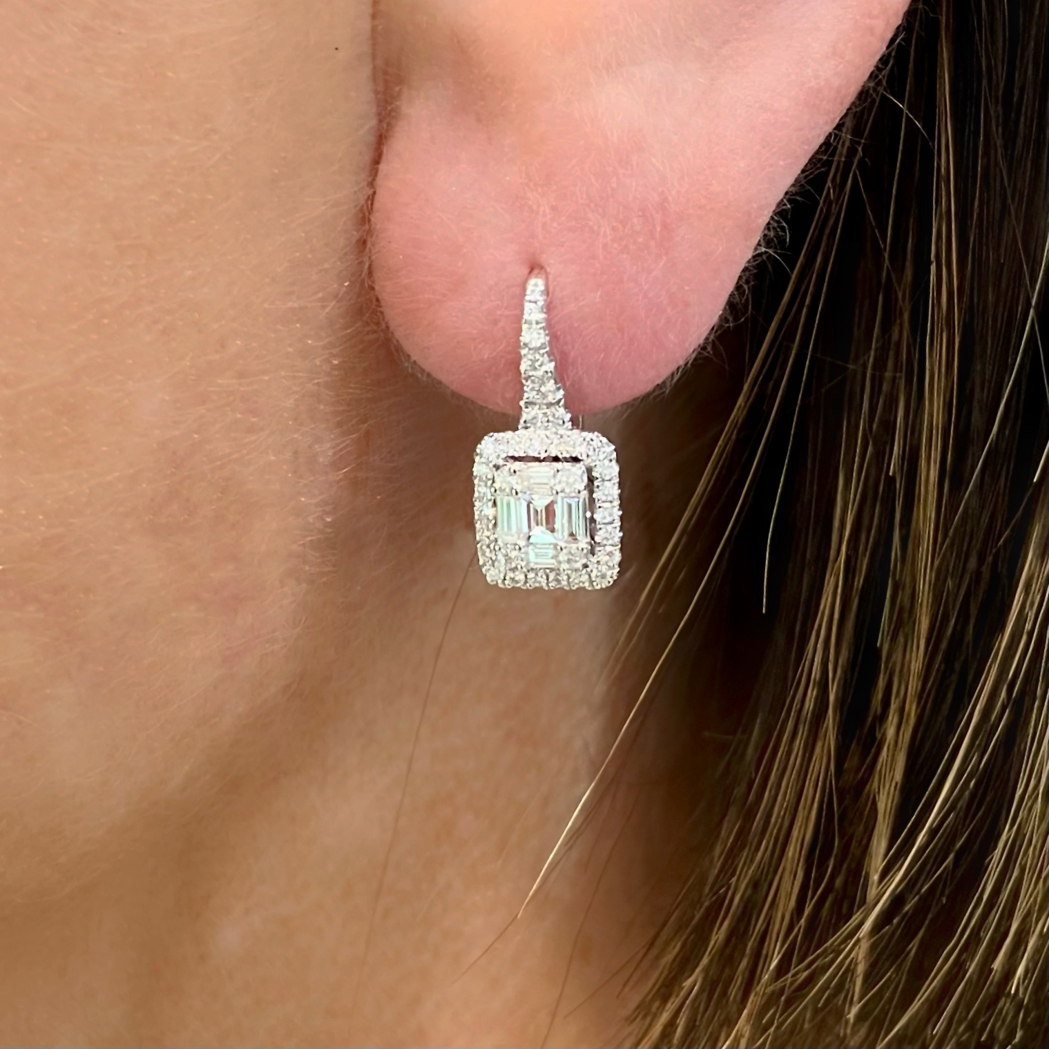 Orecchini in oro bianco con incassati diamanti taglio baguettes e brillante. Chiusura ponte curvo e molla.