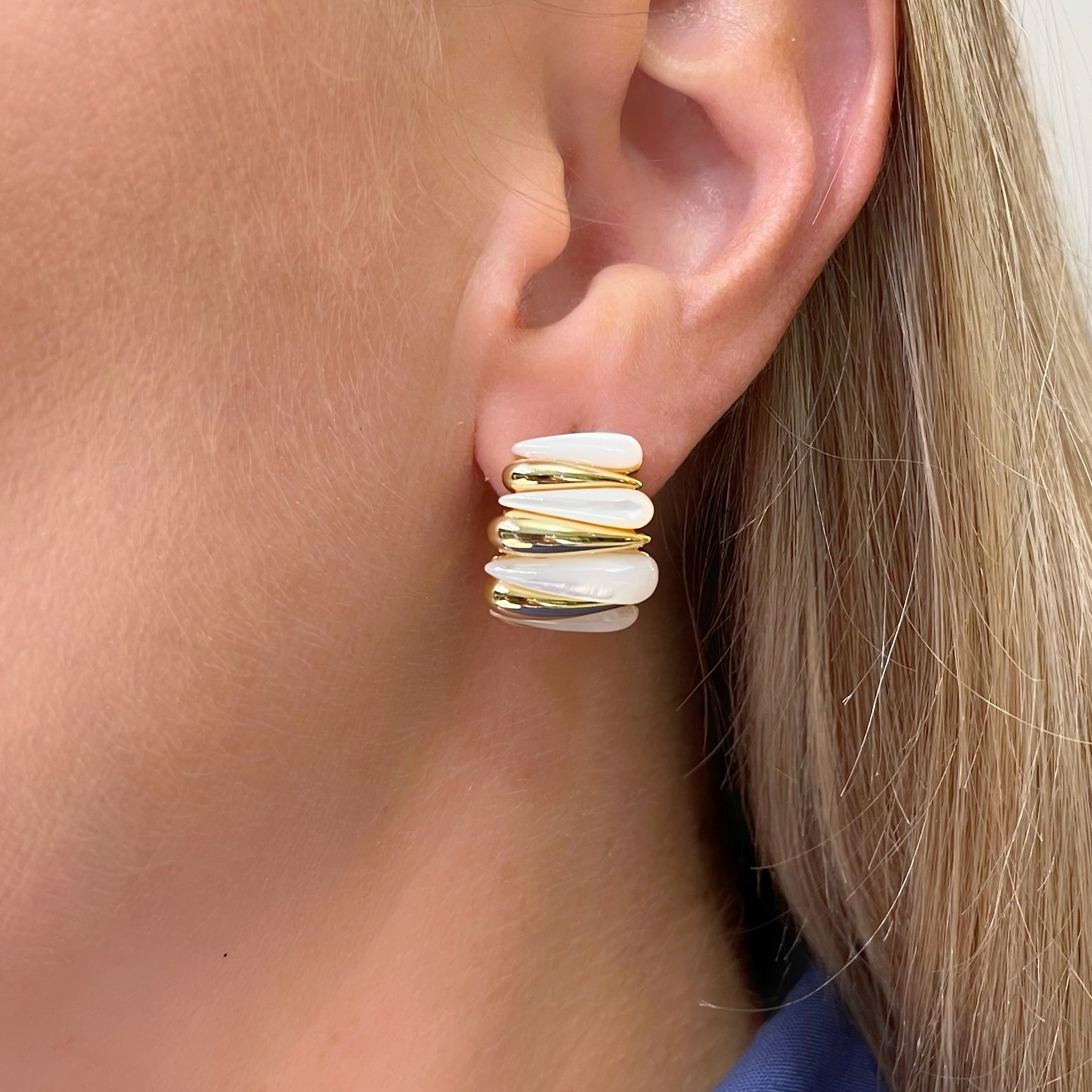 Orecchini in argento dorato con inserti di madreperla. Chiusura con pente retto retto e clips