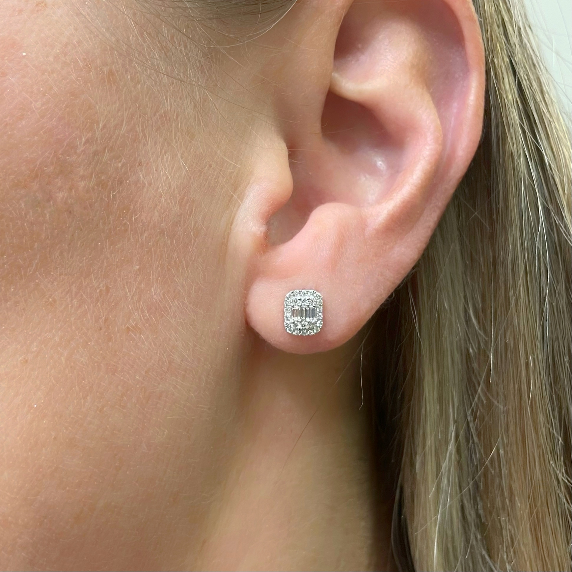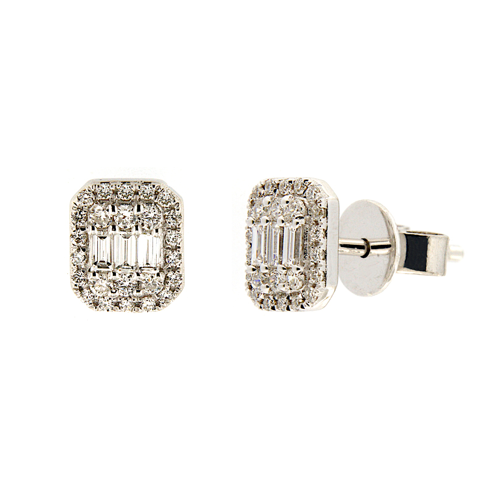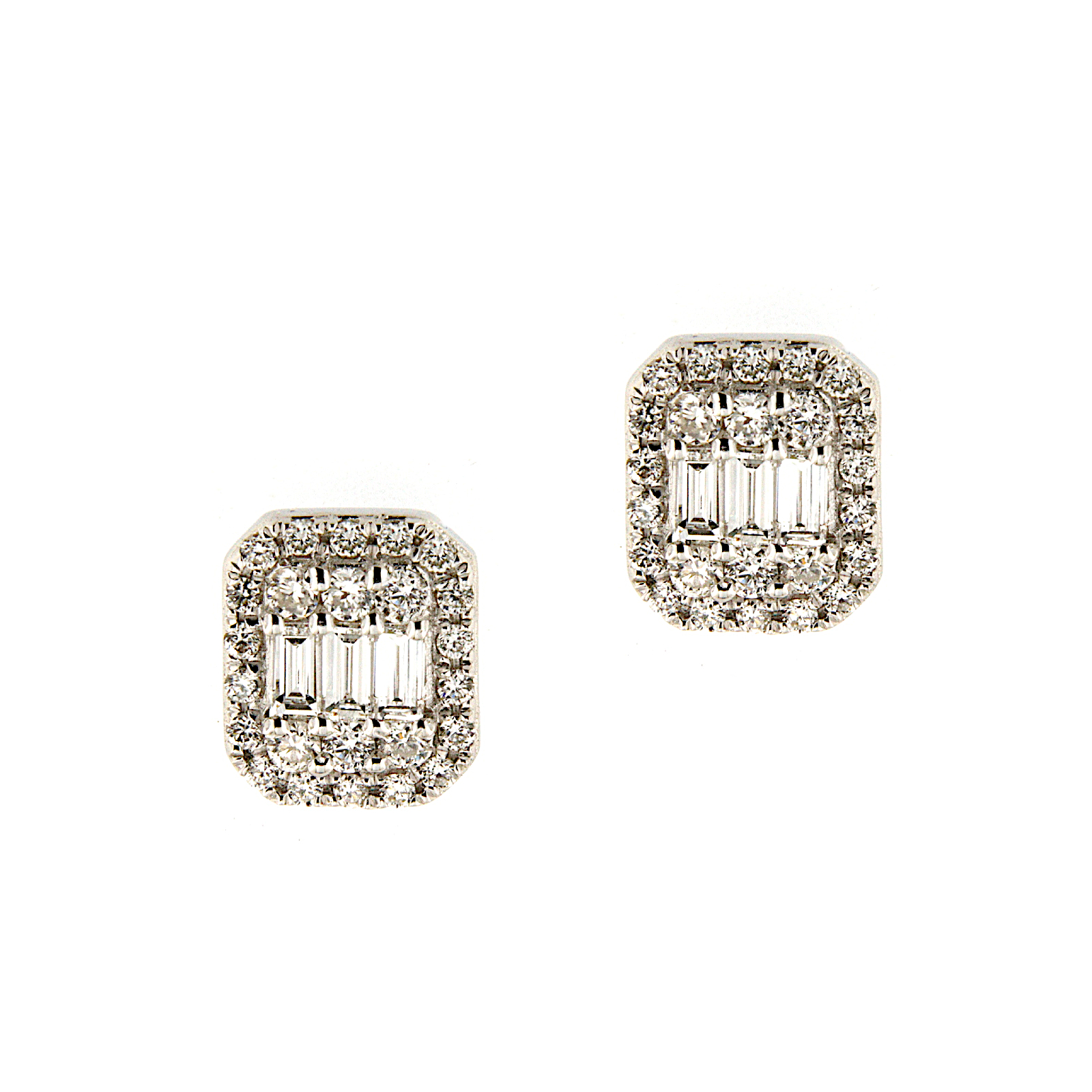 Orecchini a lobo in oro bianco con incassati diamanti taglio baguettes centrali e giro di diamanti taglio brillante esterno.
