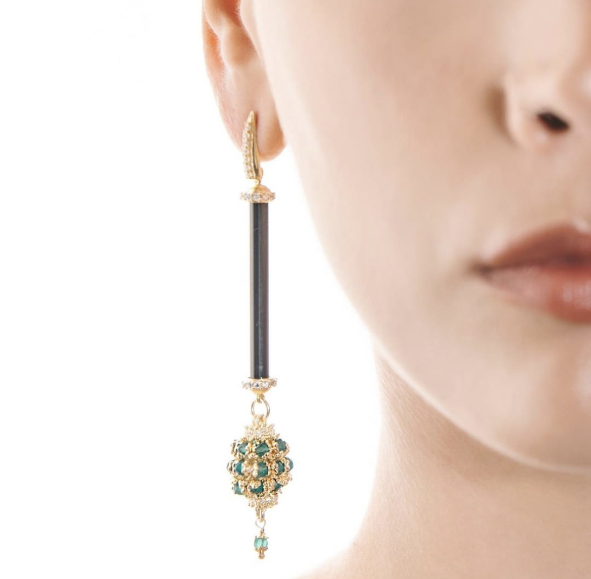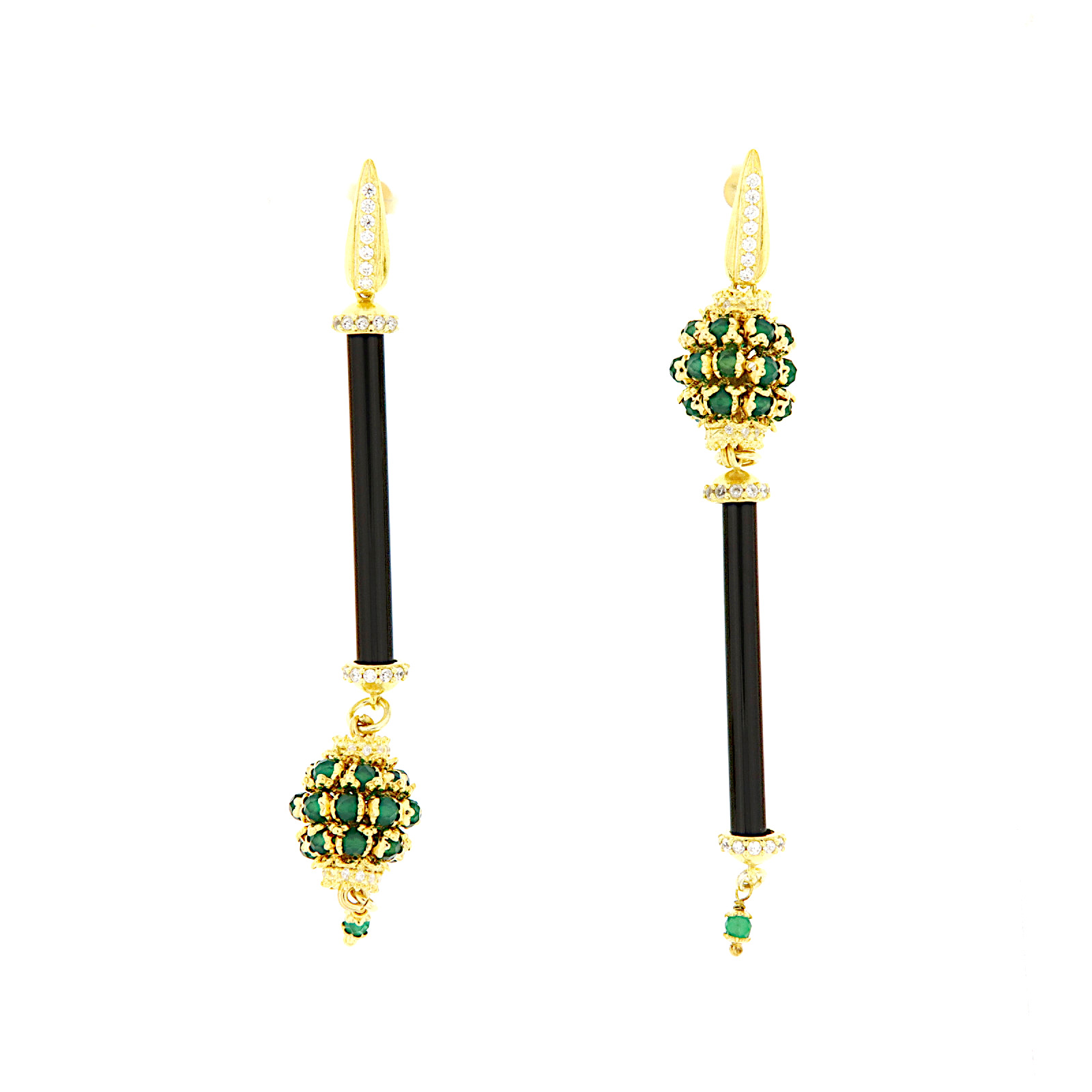 Orecchini argento dorato pendenti, con zirconi, more spinelli verdi idrotermali e cilindro in onice. Chiusura perno e vite a pressione.