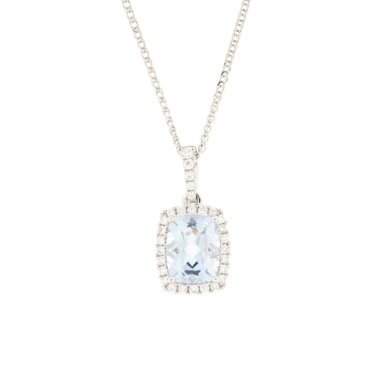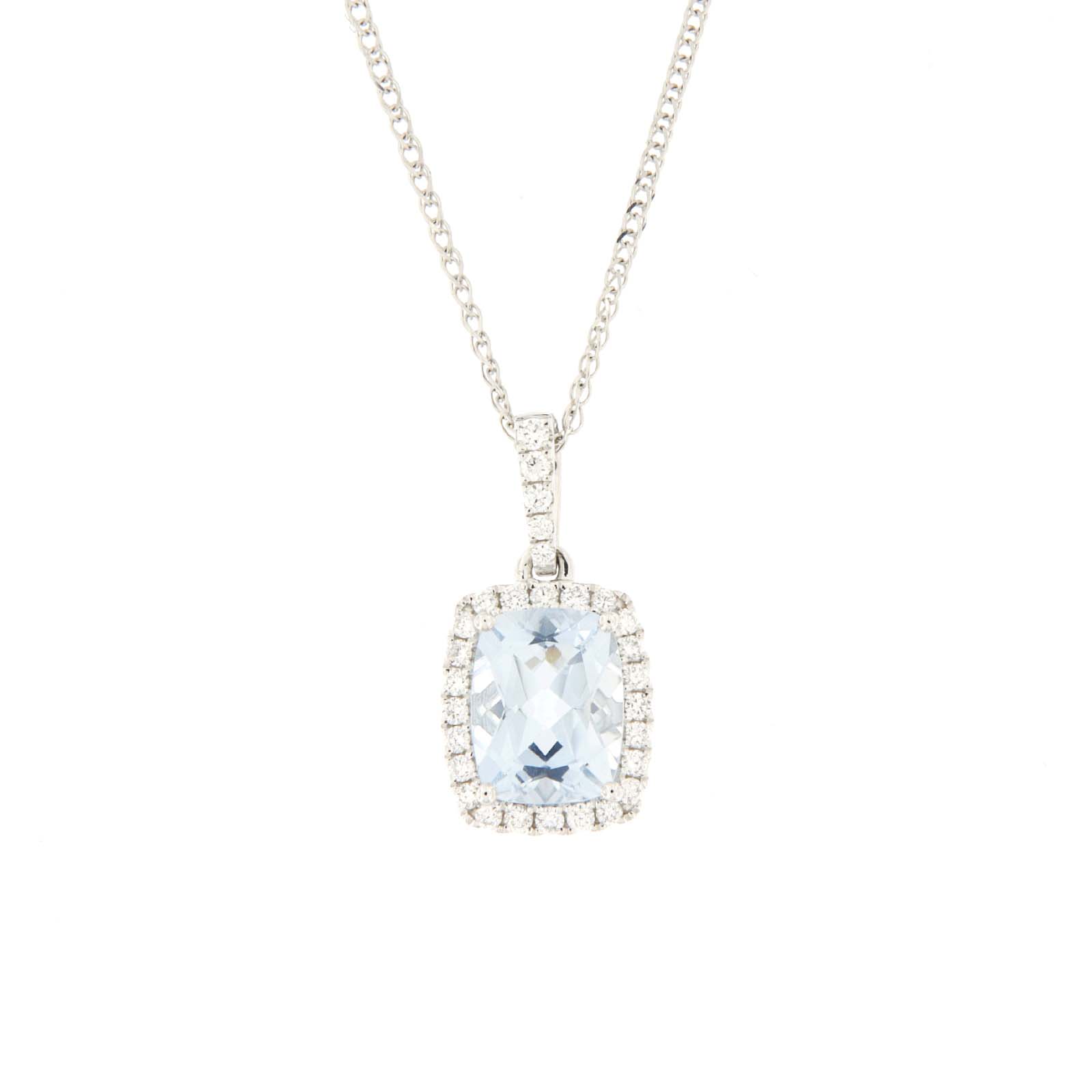 Pendente in oro bianco con acquamarina contornata da diamanti taglio brillante. Girocollo in oro bianco maglia spiga