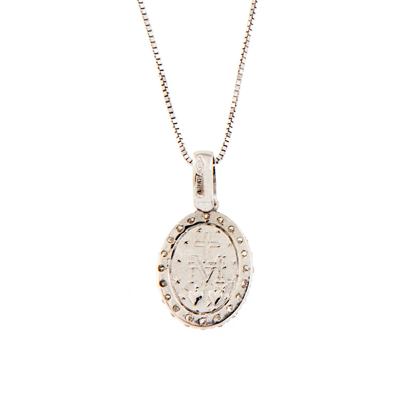 Collana a girocollo con Madonnina miracolosa in oro bianco e diamanti taglio brillante. Girocollo maglia veneziana con doppio anellino di chiusura per regolarne la misura.