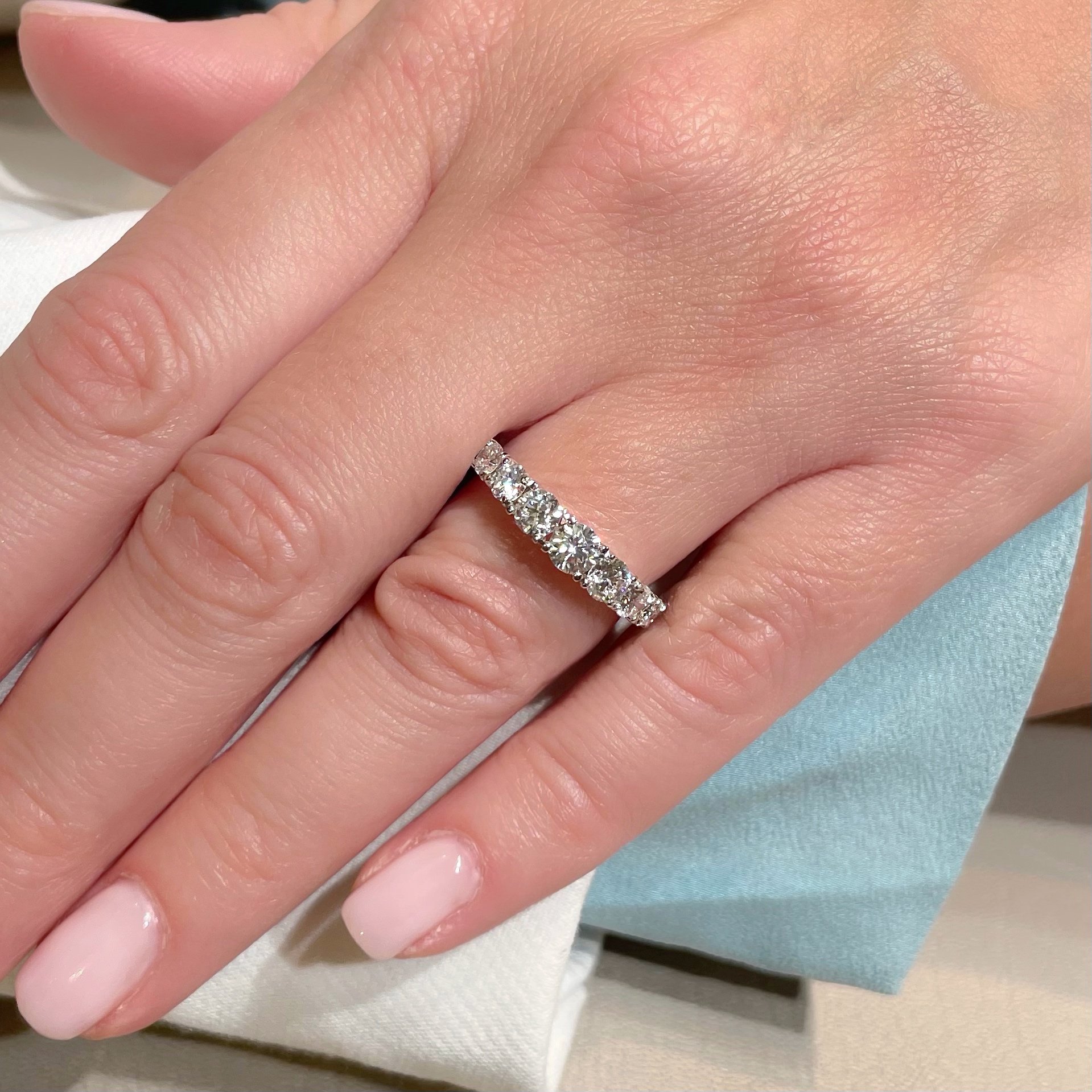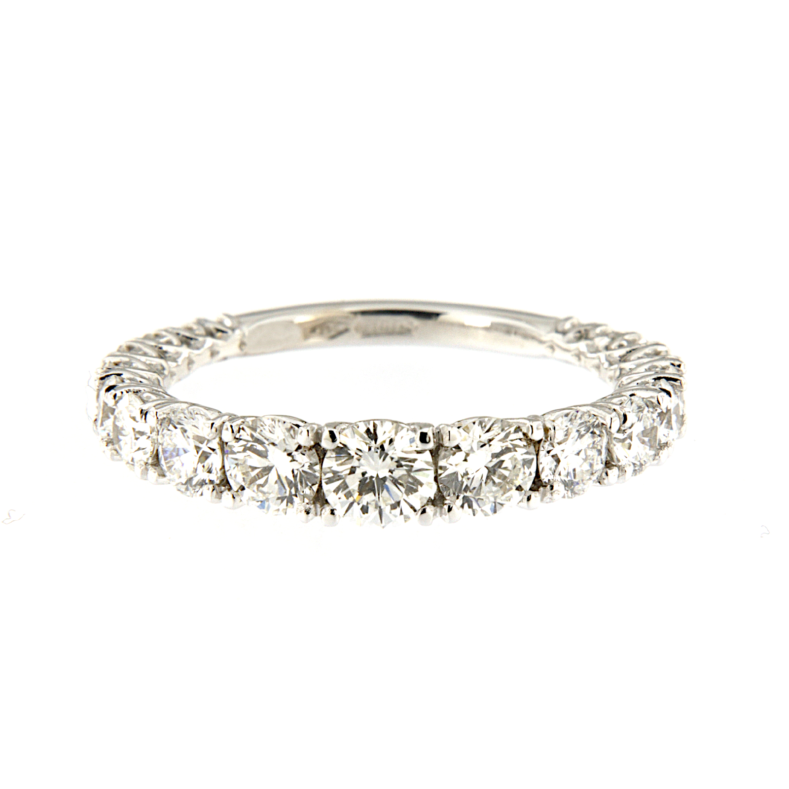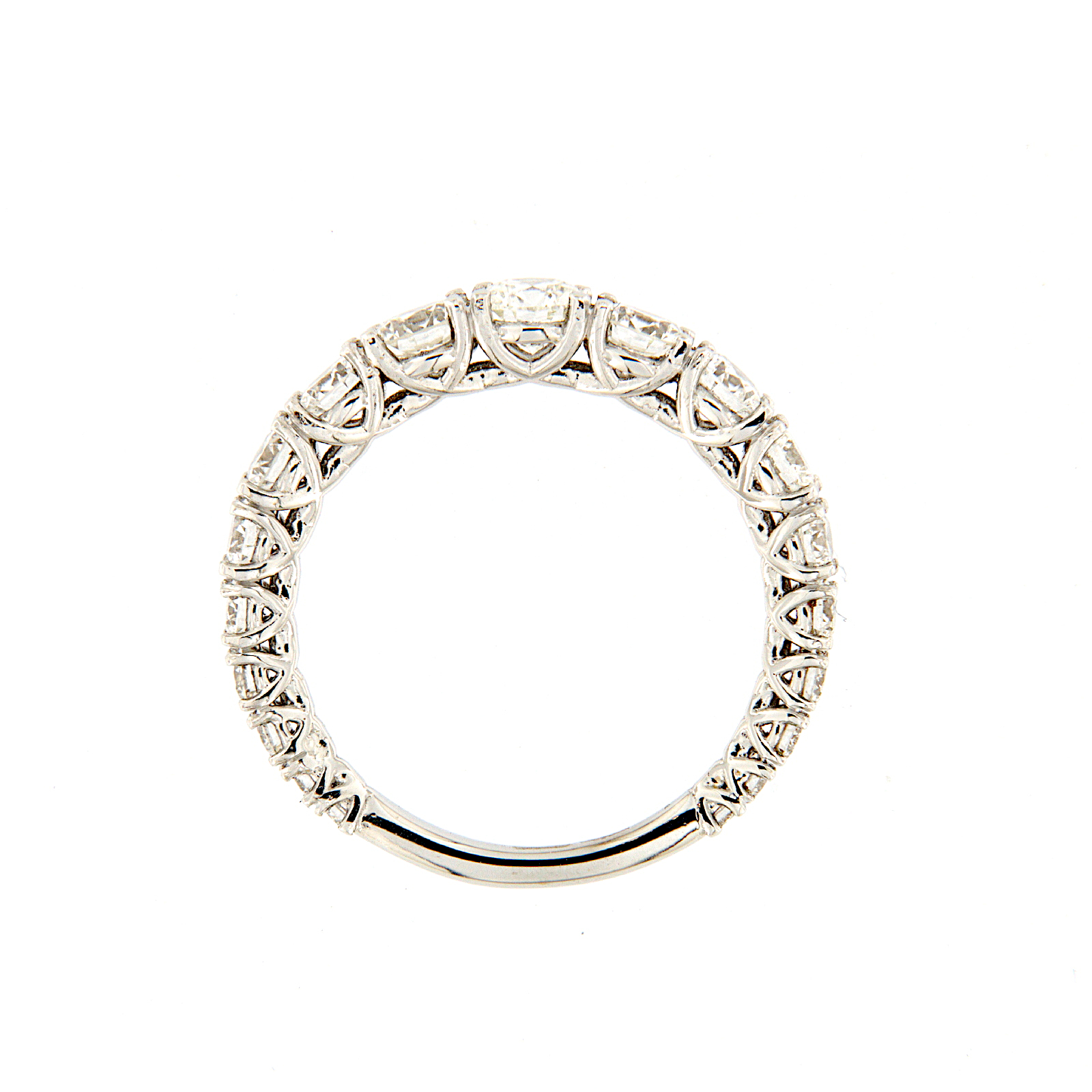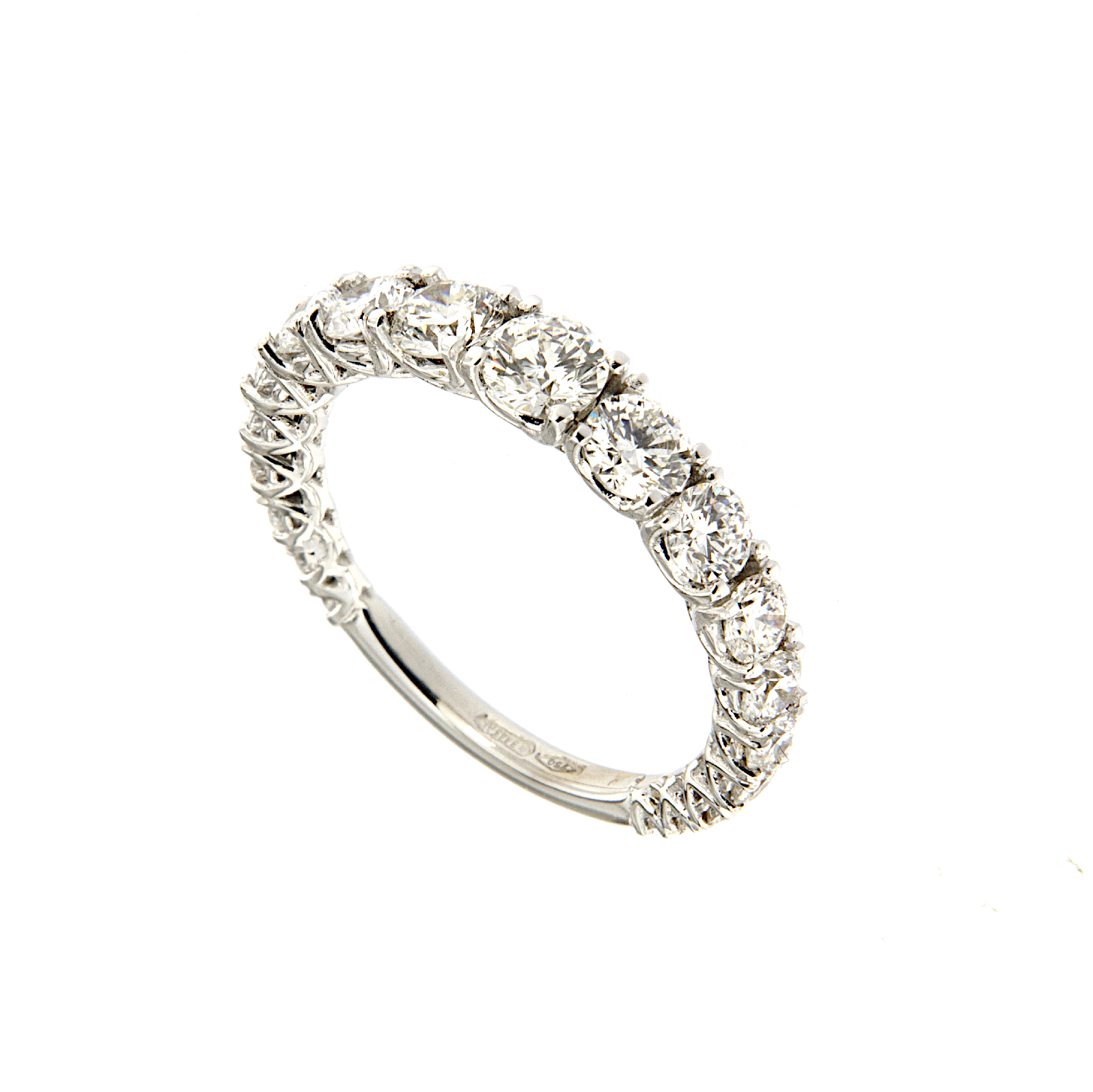 Anello a riviera in oro bianco con incassati su punte a filo diamanti taglio brillante con dimensioni a degradare.